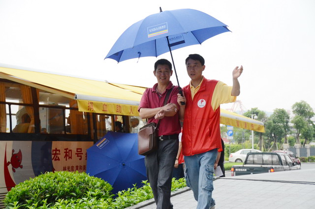 活動當(dāng)時時有小雨,志愿者熱心打傘護(hù)送獻(xiàn)血的愛心人士回大樓