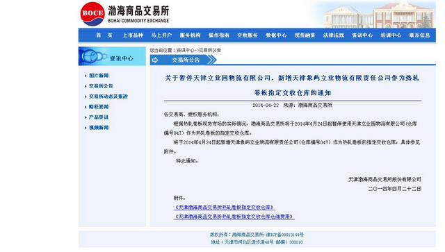 近日,天津象嶼立業(yè)物流有限責任公司與渤海商品交易所簽訂協(xié)議:天津象嶼立業(yè)物流有限責任公司成為渤海商品交易所于天津的指定交收倉庫。2014年4月23日,渤海商品交易所正式發(fā)布了市場公告。