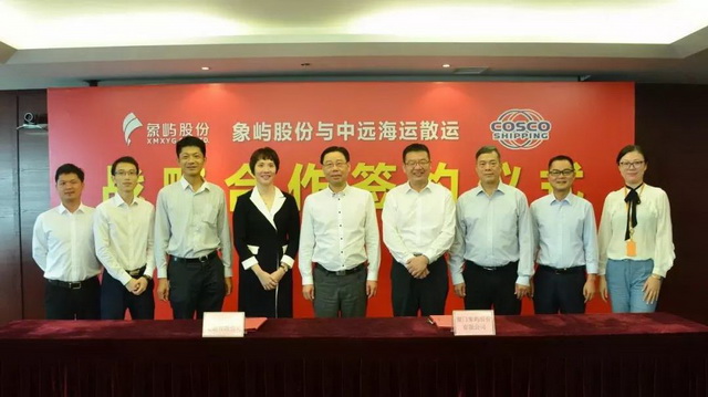 8月3日,廈門(mén)象嶼股份有限公司與中遠(yuǎn)海運(yùn)散貨運(yùn)輸有限公司舉行戰(zhàn)略合作協(xié)議簽署儀式。象嶼股份黨委書(shū)記、總經(jīng)理鄧啟東、中遠(yuǎn)海運(yùn)散運(yùn)黨委副書(shū)記、總經(jīng)理?xiàng)钪緢?jiān)分別代表雙方公司在戰(zhàn)略合作協(xié)議上簽字,象嶼股份副總經(jīng)理、象嶼速傳總經(jīng)理肖靜勤、中遠(yuǎn)海運(yùn)散運(yùn)營(yíng)銷中心總監(jiān)謝光盛等領(lǐng)導(dǎo)出席了簽約儀式。