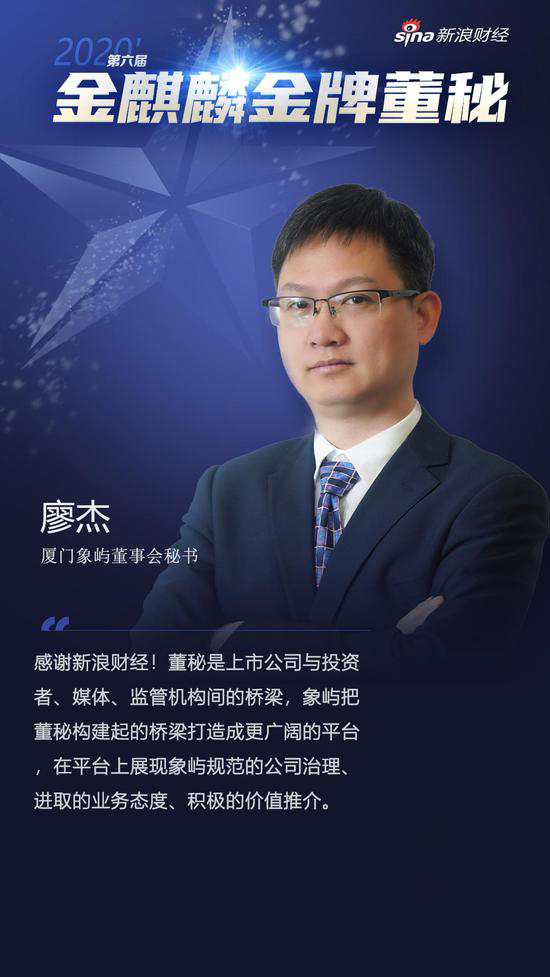 廈門象嶼董事會秘書廖杰獲評新浪財經(jīng)“2020年度金麒麟·金牌董秘”