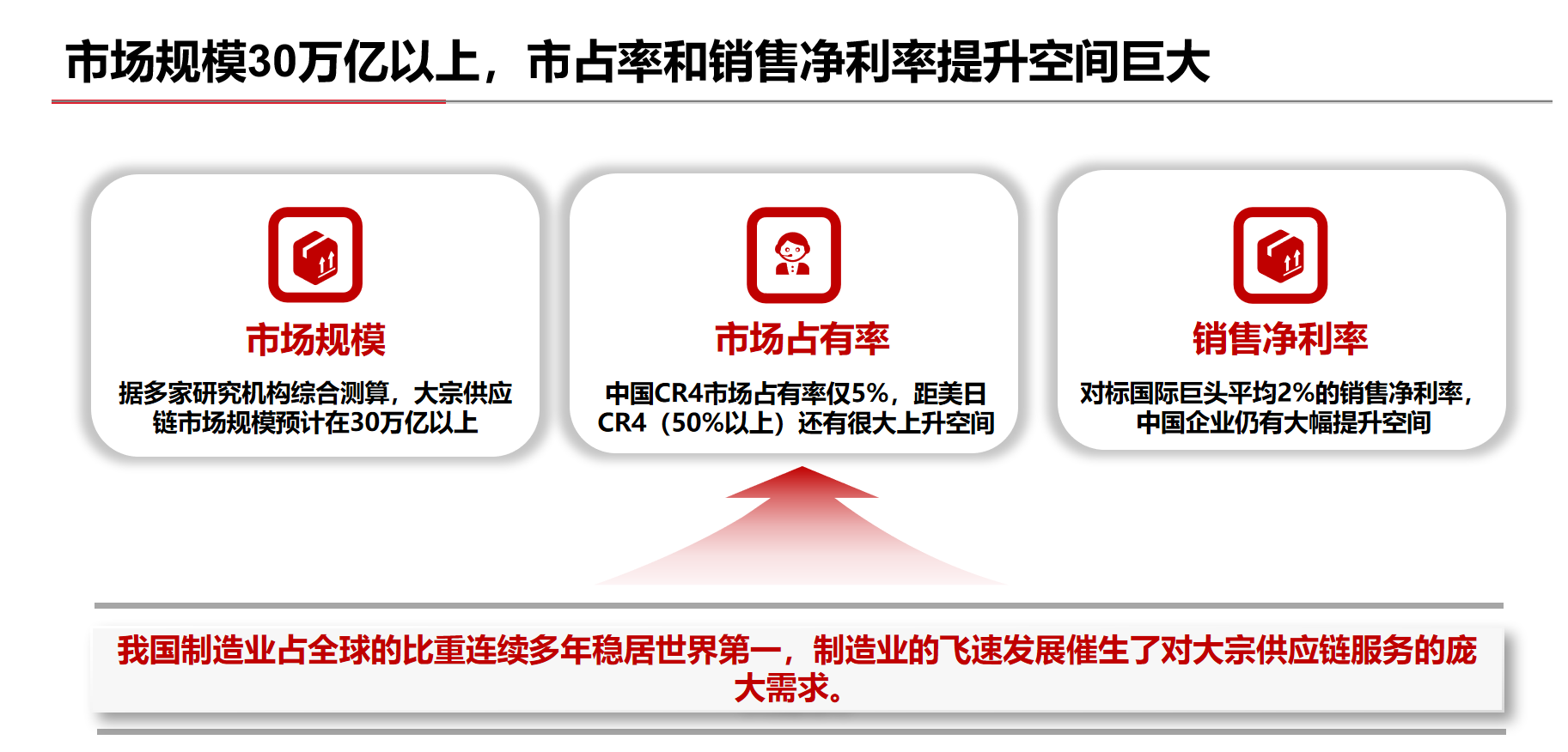 制造業(yè)企業(yè)日益專業(yè)化,對(duì)供應(yīng)鏈服務(wù)的需求從簡(jiǎn)單追求成本,轉(zhuǎn)變?yōu)楦非笮?,市?chǎng)亟需能提供“一攬子”服務(wù)、具備效率優(yōu)勢(shì)的大宗供應(yīng)鏈服務(wù)商。
